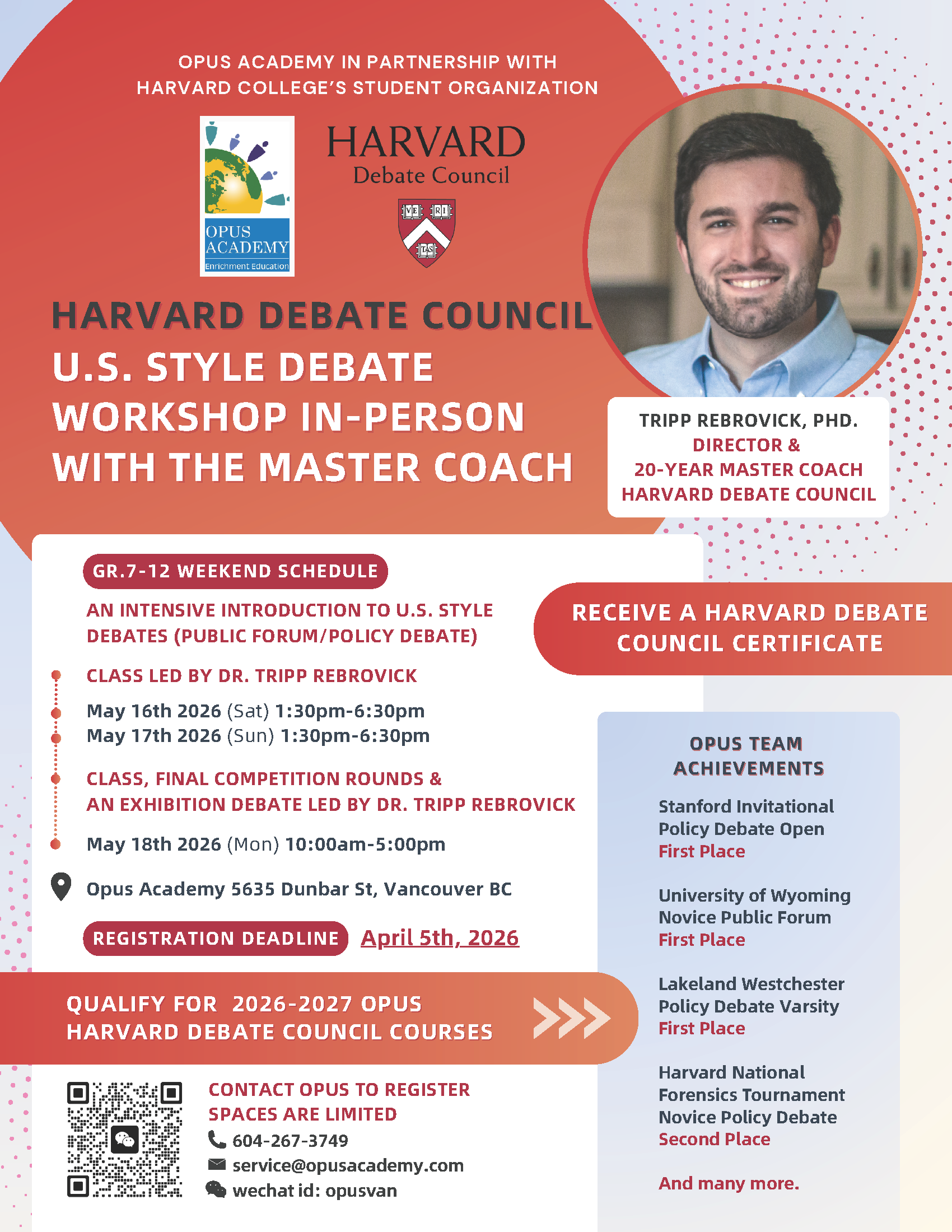 Get ready for an unforgettable experience! Opus Academy is hosting an exclusive, intensive Harvard Debate Council workshop through the May 16-18 long weekend.
